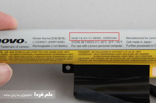 مشخصات باتری لپ تاپ لنوو Z510 رو می بینید . ولتاژ 14.4 ولت ، جریان 3350 میلی آمپری و توان 48 وات ساعت .