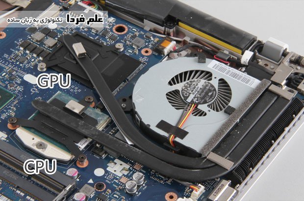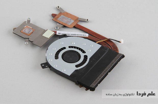 سیستم خنک کنندگی لنوو Z510 رو می بینید که یه فلز روی گرافیک لپ تاپ و یه فلز دیگه روی پردازنده لپ تاپ تعبیه شده . این فلز از جنس مس هست و رنگش مکشیه .