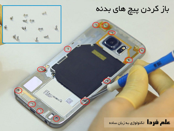 قاب پشتی GALAXY S6 با 13 تا پیچ به پنل LCD متصل هست . پس باید این 13 تا پیچ رو باز کنیم .