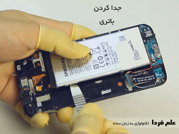 حالا می تونیم باتری رو جدا کنیم . برای این کار باید یه شی محکم زیر باتری بندازیم و اهرم کنیم . به سادگی باتری جدا میشه .