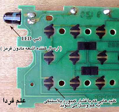 در شکل زیر می تونید به وضوح کلید ها رو مشاهده کنید . دیود ساطع کننده مادون قرمز 2 پایه که اگه نباشه کلا کنترل از کار می افته همیشه در جلوی مدار چاپی تعبیه میشه تا با گیرنده تلویزیون ( یک فتو دیود ) که شکلش تقریبا مثل همین LED هست ( اما کوچکتر و 3 پایه )  در تماس باشه . این لامپ LED مثل لامپ های LED معمولی سبز و قرمز و … است که در بازار موجوده با این تفاوت که در این لامپ یک عدد لنز مخصوص برای انتشار مادون قرمز کار گذاشتن و شما نمی تونید اونو با لامپ های LED معمولی جایگزین کنید . اما می تونید از یک کنترل دیگه بردارید و روی کنترلی که دیود ساطع کننده مادون قرمزش خرابه بذارید .