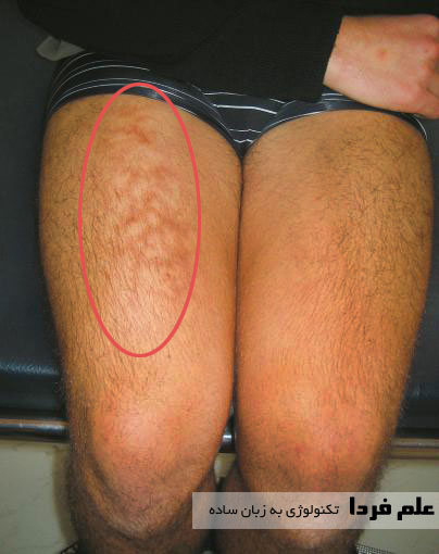 لپ تاپ قطعه الکترونیکی داره ، قطعات الکترونیکی بر اثر کار گرم میشن . شاید ندونید که گرما نوعی از اشعه مادون قرمز به حساب میاد . اگر پوست بدن به مدت زیاد یا پی در پی در معرض اشعه فروسرخ یا مادون قرمز قرار بگیره به سندرم پوست برشته شده یا به انگلیسی Toasted Skin Syndrome مبتلا میشید . این اتفاق بدون هیچ خبری میاد سراغتون یعنی به مرور و جوری که شما متوجه نمی شین ، روی پوست پاهاتون لکه های صورتی یا قرمز یا قهوه ای می بینید . مثل شکل زیر :