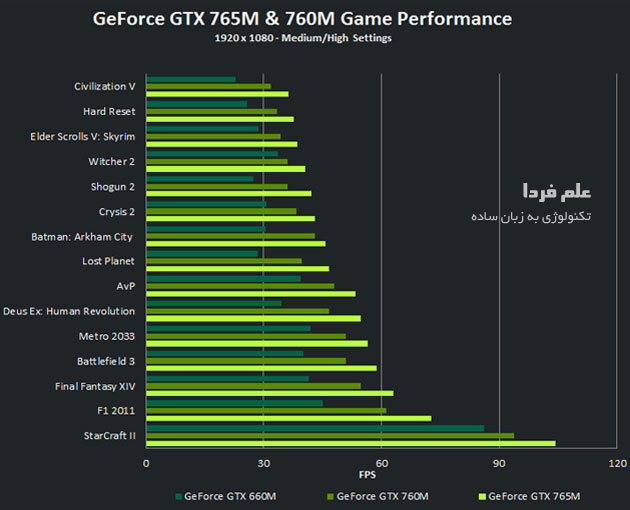 در شکل زیر مقایسه عملکرد ۳ مدل از گرافیک های استفاده شده در لپ تاپ در بازی های مختلف رو می بینیم . می بینید که هرچی عدد بزرگتره ، عملکرد هم بهتره .
