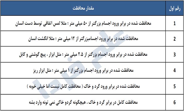 اشتباهی که شاید خیلی از سایت ها بکنن اینه که میگن رقم اول برای ورود گردو خاک هست که این کاملا اشتباهه ، الان پریز برق داریم که IP22 هست . اون رقم اول که ۲ هست یعنی انگشت انسان داخلش نمیره . پس هدف از رقم اول ، صرفا گردوخاک نیست . ( گرد خاک هم نوعی جسم محسوب میشه تو این مورد ) . تو جدول زیر می تونید مفهوم تمام ارقام رو ببینید .