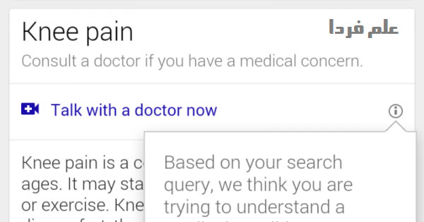 تاریخ انتشار : ۲۲ مهر ۱۳۹۳تو این چند روزه مطالب زیادی منتشر شد مبنی بر اینکه گوگل داره یه سرویس ویدیو چت بین پزشکان و بیماران رو آزمایش کنه . دقیقا هر چی که تو بچگی مون تو کارتونا میدیم الان گوگل داره انجام میده . البته این خبر فعلا در حد شایعه است اما مثه اینکه یکی از کاربرای شبکه اجتماعی Reddit یه عکس منتشر کرده و گفته موقعی که داشته تو گوگل درباره « زانو درد » جستجو می کرد با عبارت Talk with a doctor now و یه آیکن دوربین فیلم برداری مواجه میشه که وقتی روی آیکن کلیک میکنه یه پیام ظاهر میشه :