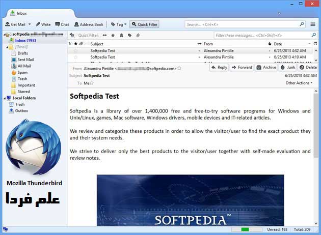 نرم افزار مدیریت ایمیل Mozilla Thunderbird یک نرم افزار نرم افزار کاملا رایگان و متن بازه  Open-source که برای سیستم عامل های لینوکس ، ویندوز و مک Mac منتشر شده . واژه Thunderbird در واقع نام یک پرنده ی افسانه ایه که معروفه به پرنده رعد و برق معروفه . برنامه Mozilla Thunderbird در ۲۸ جولای ۲۰۰۳ منتشر شد . برنامه Mozilla Thunderbird به ۵۳ زبان دنیا ( ازجمله زبان فارسی ) ترجمه شده و برای افرادی که انگلیسی شون خوب نیست یک گزینه بسیار مناسبه . محیط برنامه مازیلا ثاندر برد Mozilla Thunderbird بسیار ساده است و نیاز به تنظیمات خاصی نداره . فقط کافیه نام کاربری و رمز عبور ایمیل تون رو وارد کنید . به نظر Mozilla Thunderbird من بهترین نرم افزار مدیریت ایمیل هاست و من به همه توصیه میکنم از این نرم افزار استفاده کنید .