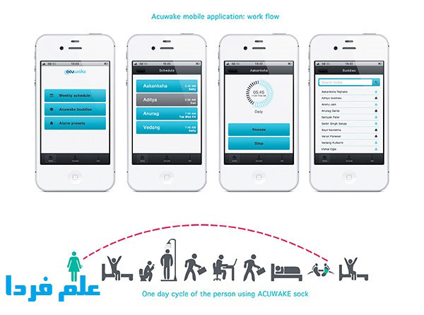 تاریخ انتشار : ۱۱ خرداد ۱۳۹۳همه ما کم و بیش با بیدار شدن از خواب مشکل داریم . به هر روش ما رو از خواب بیدار کنن بازم فک می کنیم در حق مون ظلم شده 😀 حالا اخیرا خانم Aakanksha Rajhans ( طراح صنعتی ) یک جفت جوراب بسیار جالب ساخته که به طرز کاملا متفاوتی شما رو از خواب بیدار میکنه ! در کف این جوراب لرزاننده های کوچیکی Micro Vibrator به کار رفته که نقاط خاصی از کف پاهاتون رو ماساژ میده . ماساژ این نقاط از پا موجب بهبود کارایی قلب ، سیستم گوارشی و تقویت ستون فقرات میشه . یک نرم افزار موبایلی هم برای این گجت جالب ساخته شده تا فرد بتونه ACUWAKE برای ساعت مشخصی تنظیم کنه . در ساعت تعیین شده micro vibrator ها به آرومی نقاط خاصی از کف پاهاتون رو خیلی لطیف ماساژ میده تا یه وقت ناز نشین الهی 😀 برای غیر فعال کردن ACUWAKE کافیه از جاتون باشید و رو پاهاتون وایستید ، خودش اتومات خاموش میشه . پورت شارژ باتری ACUWAKE در بغل این گجت تعبیه شده . روی ACUWAKE یه کنسول تعبیه شده که از طریق بلوتوث با موبایل تون ارتباط برقرار میکنه تا مدت زمان و شدت لرزش رو کنترل کنه . روی کنسول یه صفحه نمایش دیجیتال هم هست که باهاش می تونید یه سری تنظیمات ساده رو انجام بدین . جالب اینجاست که این کنسول به راحتی از جوراب جدا میشه و میتونید جوراب رو بشورید .