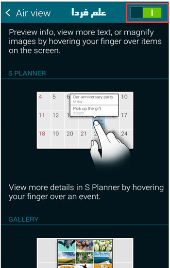 واردش که بشید یه سری توضیحات می بینید ، حالا از بالای صفحه وضعیتش رو سبز یا روشن کنید . تو همون صفحه در مورد برنامه هایی که از قابلیت air view پشتیبانی می کنن ، توضیحات و راهنمایی نوشته . گالری ، اس ام اس ، ویدیو ، تقویم یا S Planner و کیپد ( شماره گیر ) از این دست برنامه ها هستن .