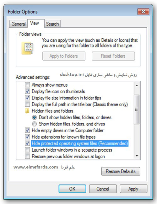 همونطور که عرض کردم خدمت تون فایل desktop.ini یک نوع فایل سیستمی در ویندوزه که وظیفه ش سفارشی کردن پوشه هاست . desktop.ini هم مانند سایر فایل های سیستمی تحت حفاظت ویندوزه و به طور پیش فرض مخفیه ! گاهی وقتا دوس دارید که در این فایل تغییراتی ایجاد کنید اما خوب این فایل ها قابل روئیت نیستن که بتونید بازشون کنید بنابراین لازمه بدونید که این فایل رو چطور نمایش بدین . برای این کار یک پنجره در Computer باز کنید و بعد از منیوی Organize رو گزینه Folder and Search options کلیک کنید . در پنجره ای که باز شده به تب ( سربرگ ) View برید و گزینه Hide Protected Operating System Files رو پیدا کنید . توجه داشته باشید که اگر تیک این گزینه رو بردارید همه فایل های سیستمی مخفی ، نمایش داده میشن و اگر این گزینه رو تیک بزنید دوباره همه فایل های سیستمی مخفی میشن !