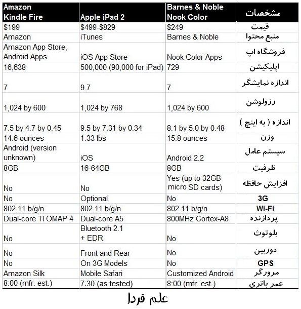 در زیر جدول مقایسه مشخصات آیپد 2 ، کیندل فایر و نوک کالر را مشاهده بفرمایید :