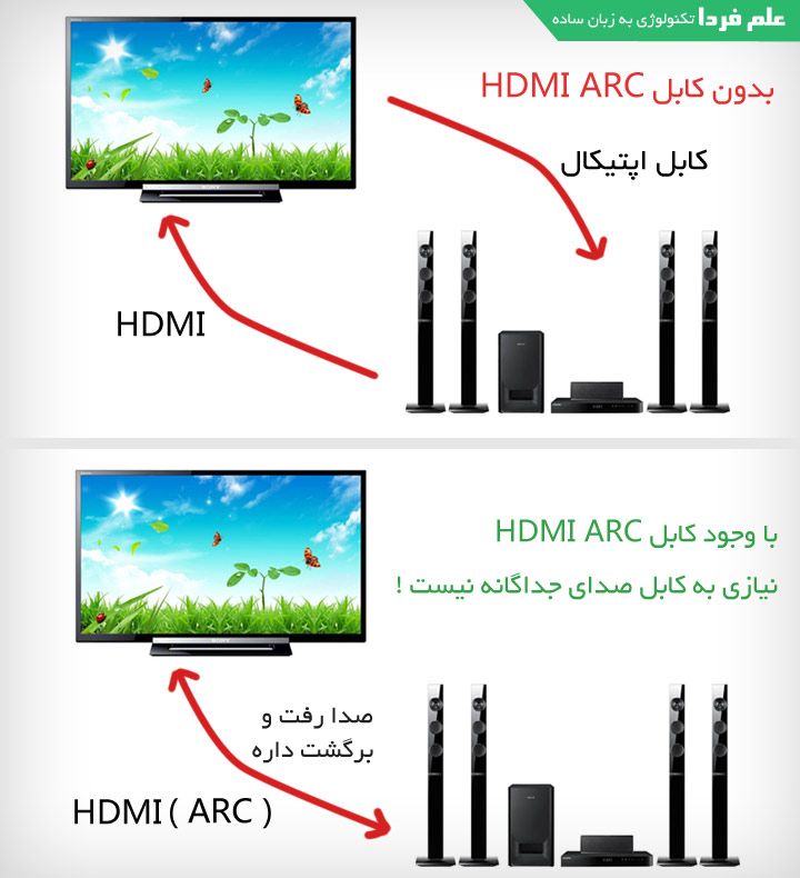 همونطور که گفتم ، HDMI ARC واسه اینه که صدا ، به صورت رفت و برگشتی انجام بشه . تو حالت عادی واسه اینکه صدای تلویزیون رو از سیستم صوتی گوش کنید حتما باید از کابل دو فیش قرمز و سفید و یا کابل اپتیکال استفاده کنید اما با وجود HDMI ARC می تونید تصویر رو از سیستم صوتی ( معمولا دی وی دی پلیر یا بلوری پلیر ) به تلویزیون بدید و صدا رو هم همزمان با همون کابل پس بگیرید . پس این کابل دو تا کار می کنه . یکی اینکه تصویر دی وی دی پلیر رو به تلویزیون منتقل می کنه و دوم اینکه موقعی که تلویزیون نگاه می کنید می تونید صدا رو با کیفیت بهتر از سیستم صوتی گوش کنید .