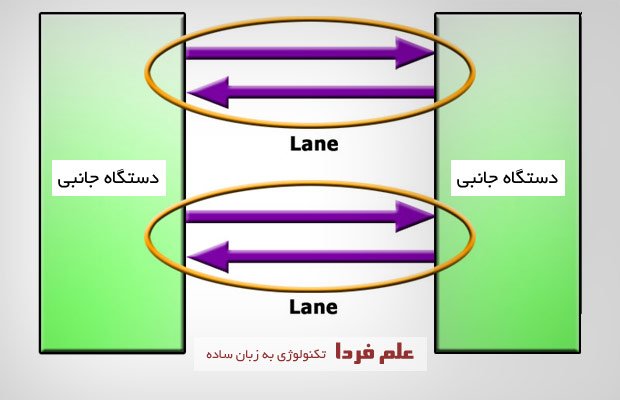 PCI Express بر اساس مسیرهایی به نام Lane کار میکنه ، هر lane دو تا مسیر داره ، یکی برای ارسال و یکی هم برای دریافت دیتا . در واقع هر مسیر خودش به 2 تا سیم تقسیم میشه یعنی مسیر ارسال 2 تا سیم و مسیر دریافت هم 2 تا سیم . پس مجموعا هر lane چهار تا سیم داره . این خطوط ارتباطی ( lane ) به صورت تک بیتی و ارسال و دریافت همزمان کار می کنن . هرچی این خطوط بیشتر باشه ، دیتای بیشتری عبور میکنه پس پهنای باند بیشتر میشه . این خطوط رو با حرف x و یه عدد نشون میدن مثلا x8 یعنی 8 تا خط ارتباطی بین دو دستگاه وجود داره . شکل زیر رو ببینید متوجه میشید .