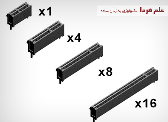 به خاطر وجود دستگاه های مختلف و صرفه جویی در هزینه و طراحی مادربوردها و مواد اولیه ، چند مدل اسلات که از نظر فیزیکی با هم فرق می کنن وجود داره . منظورم اینه از لحاظ عملکرد ریشه ای ، تفاوتی ندارن فقط پهنای باند و ظاهر متفاوت دارن . در حال حاضر اسلات های x1 و x2 و x4 و x8 و x16 موجود هستن اما اسلات های x1 و x16 خیلی بیشترن روی مادربوردها . اسلات x16 همون اسلاتی هست که کارت گرافیک تون رو توش جا می زنید .