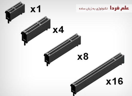به خاطر وجود دستگاه های مختلف و صرفه جویی در هزینه و طراحی مادربوردها و مواد اولیه ، چند مدل اسلات که از نظر فیزیکی با هم فرق می کنن وجود داره . منظورم اینه از لحاظ عملکرد ریشه ای ، تفاوتی ندارن فقط پهنای باند و ظاهر متفاوت دارن . در حال حاضر اسلات های x1 و x2 و x4 و x8 و x16 موجود هستن اما اسلات های x1 و x16 خیلی بیشترن روی مادربوردها . اسلات x16 همون اسلاتی هست که کارت گرافیک تون رو توش جا می زنید .