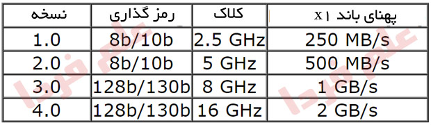 حالا که این مسئله رو فهمیدید یه چیزی بگم : چون نسخه یک و دو تکنولوژی PCI Express هر دو از روش رمزگذاری 8b/10b استفاده می کنن ، برای دو برابر کردن پهنای باند از نسهخ یک به دو ، باید سرعت کلاک پالس نسخه دوم ، دو برابر بشه . اما نسخه سوم چون از رمزگذاری 128b/130b استفاده می کنه برای دو برابر شدن پهنای باند لازم نیست کلاک خودش رو دو برابر کنه یعنی 10 گیگاهرتز ، با 8 گیگاهرتز می تونه پهنای باند دوبرابری نسبت به نسخه دوم داشته باشه نسخه چهار PCI Express هم از رمزگذاری 128b/130b استفاده میکنه پس برای دوبرابر کردن پهنای باند نسبت به نسخه سوم ، باید کلاک پالسش رو دوبرابر کنه یعنی 16 گیگاهرتز . جدول زیر رو نگاه کنید .