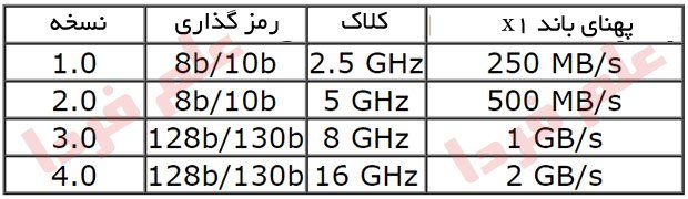 حالا که این مسئله رو فهمیدید یه چیزی بگم : چون نسخه یک و دو تکنولوژی PCI Express هر دو از روش رمزگذاری 8b/10b استفاده می کنن ، برای دو برابر کردن پهنای باند از نسهخ یک به دو ، باید سرعت کلاک پالس نسخه دوم ، دو برابر بشه . اما نسخه سوم چون از رمزگذاری 128b/130b استفاده می کنه برای دو برابر شدن پهنای باند لازم نیست کلاک خودش رو دو برابر کنه یعنی 10 گیگاهرتز ، با 8 گیگاهرتز می تونه پهنای باند دوبرابری نسبت به نسخه دوم داشته باشه نسخه چهار PCI Express هم از رمزگذاری 128b/130b استفاده میکنه پس برای دوبرابر کردن پهنای باند نسبت به نسخه سوم ، باید کلاک پالسش رو دوبرابر کنه یعنی 16 گیگاهرتز . جدول زیر رو نگاه کنید .