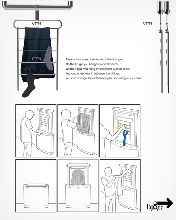 این دستگاه دو نوع آویز داره که تو عکس با عنوان A و B مشخص شدن. در قسمت A لباس های بزرگ تر و در قسمت B لباس های کوچیکتر قرار میگیرن.
