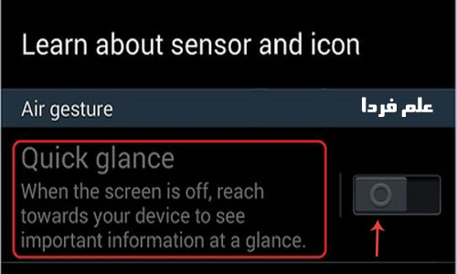 البته در هر کدوم از گوشی ها مسیر رفتن به Quick Glance متفاوته . مثلا در نوت ۳ تو قسمت تنظیمات ، تو تب Control و گزینه Air gesture یا تو گلکسی اس ۴ اگه منیوی کلی باز بشه همونجا گزینه Air gesture رو می تونید فعال کنید . خلاصه دنبال گزینه Air gesture و Quick Glance بگردید .